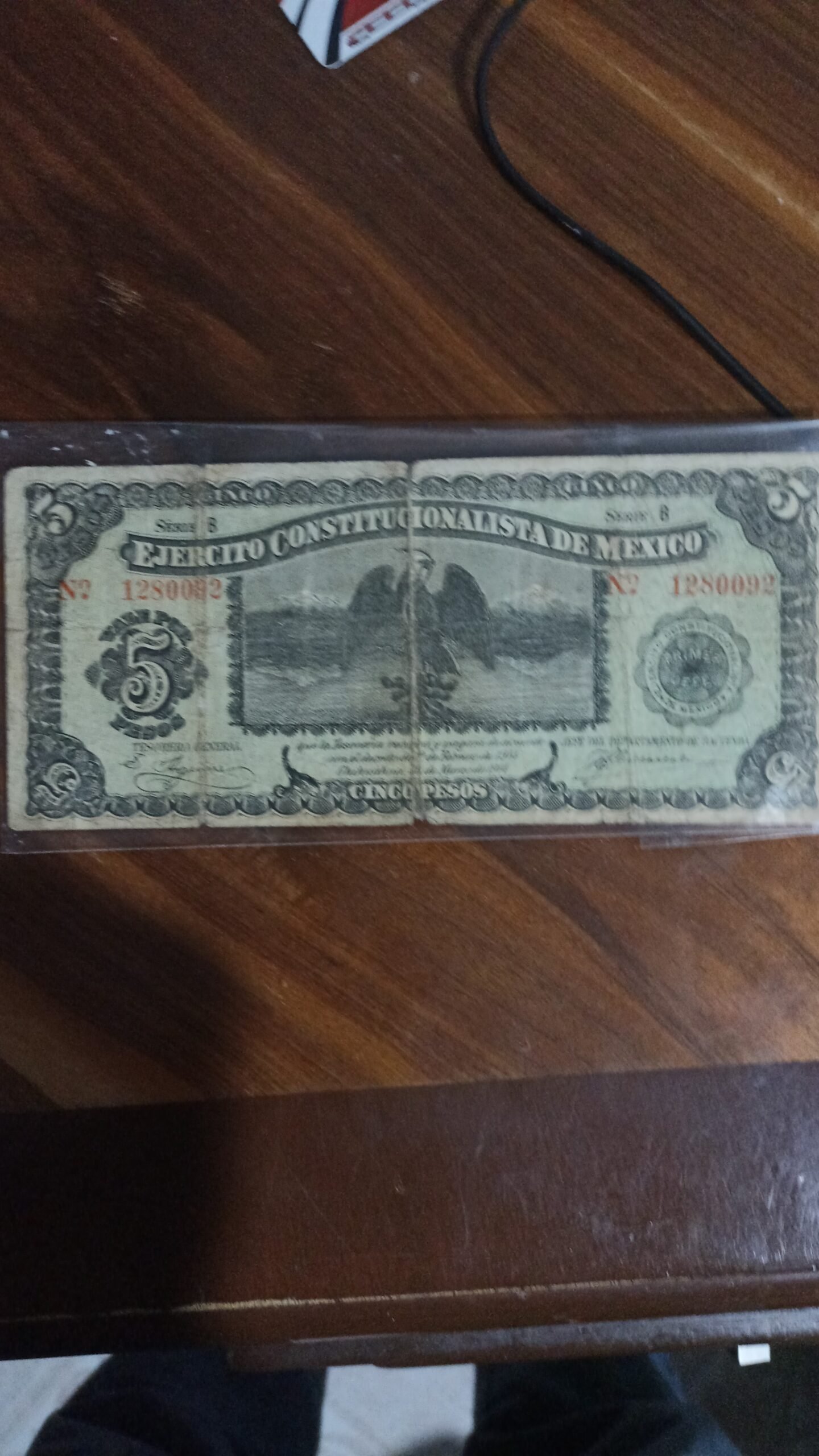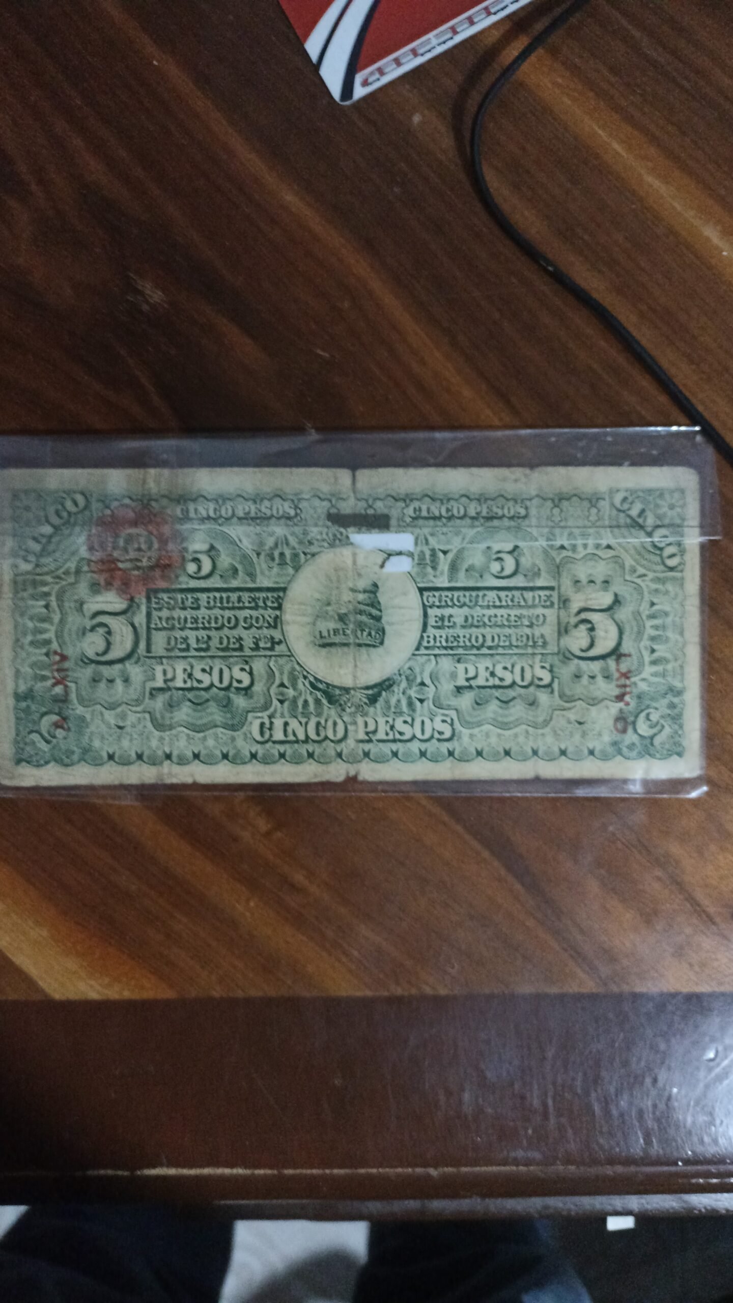 BILLETE DE COLECCION CINCO PESOS EJERCITO CONSTITUCIONALISTA DE MEXICO AÑO 1914