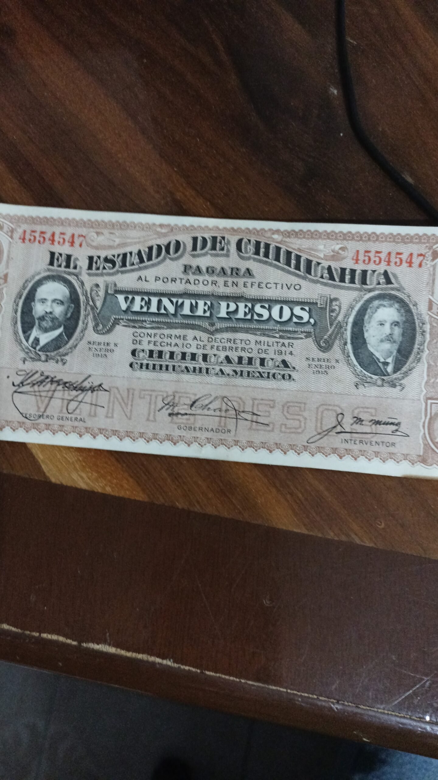 BILLETE DE COLECCION DE VEINTE PESOS DOS CARITAS ESTADO DE CHIHUAHUA AÑO 1914